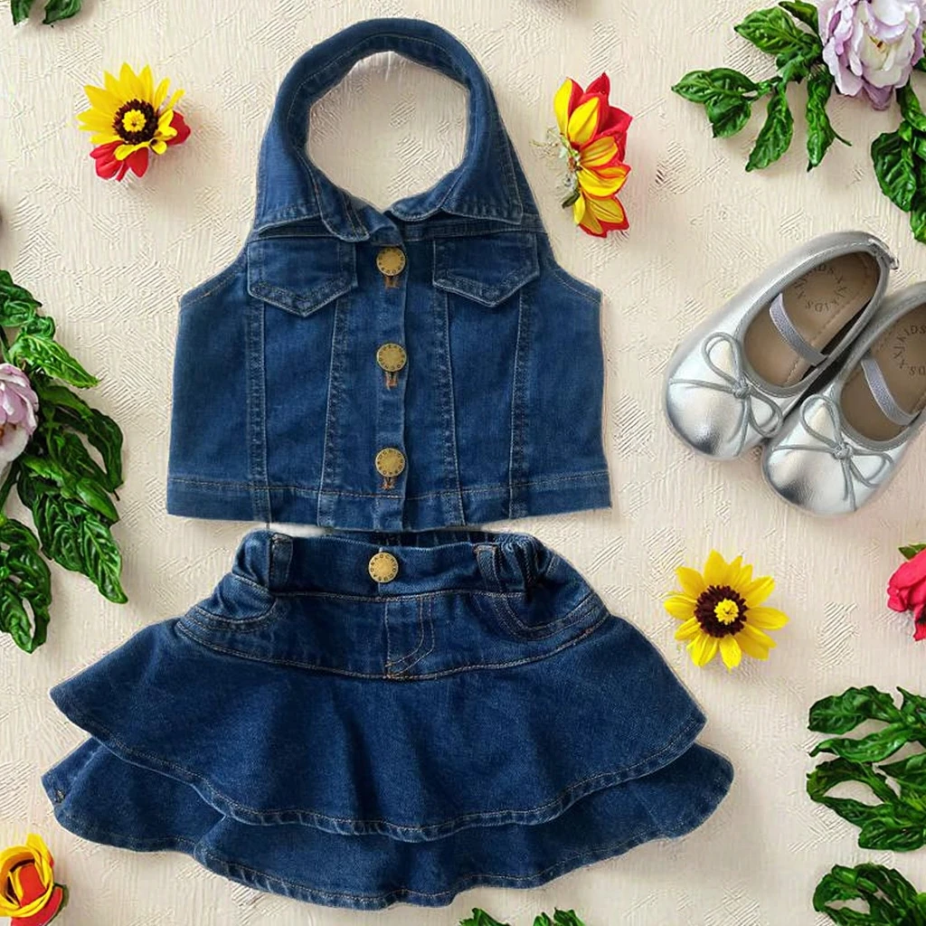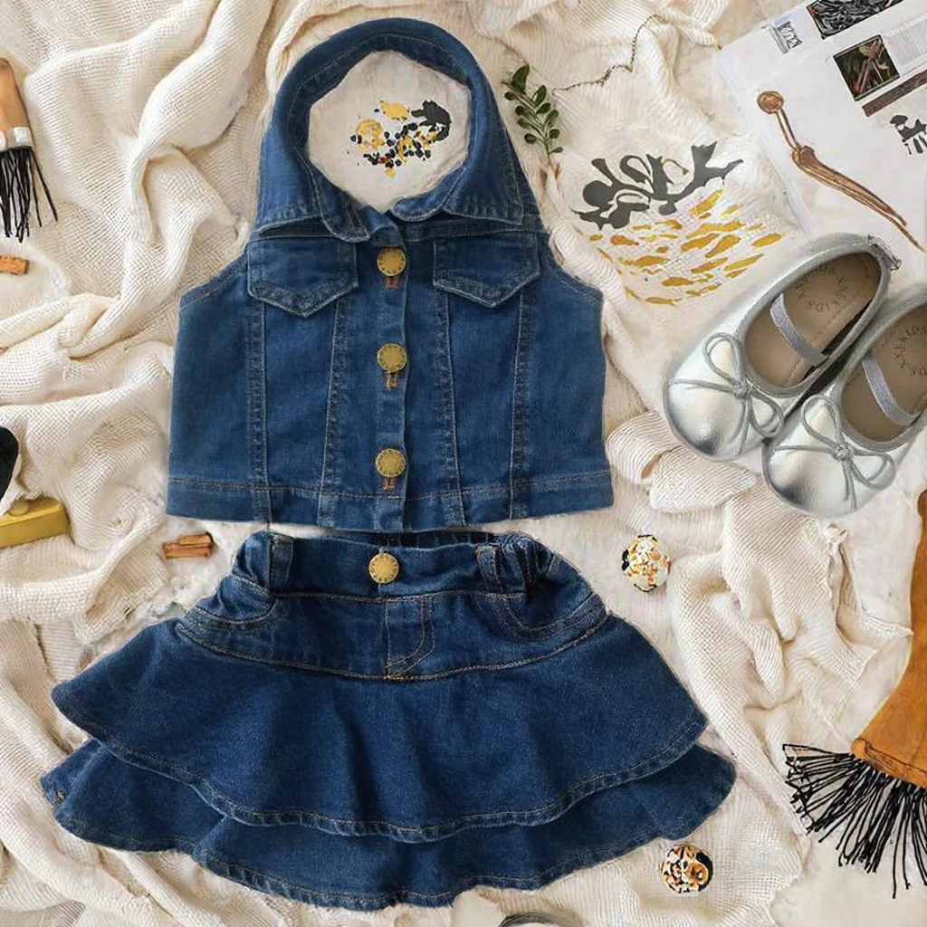 Fashion Boutique Summer Sleeveless Top and Skirt 2pcs Denim Clothes Sets Girls Clothes for Kids